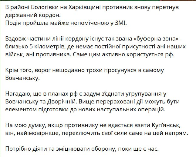 "Именно этим активно пользуется РФ. Кроме того, враг недавно немного продвинулся в самом Волчанске", – написал он.