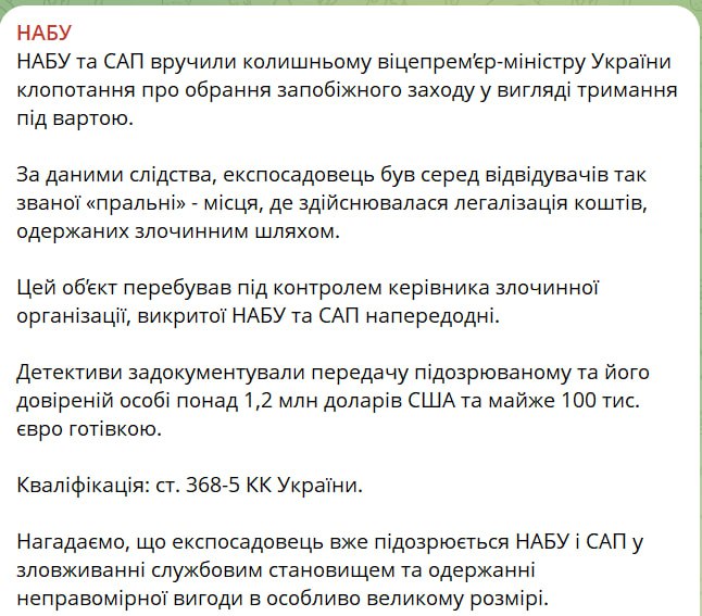 "НАБУ и САП вручили бывшему вице-премьер-министру Украины ходатайство об избрании меры пресечения в виде содержания под стражей", - говорится в сообщении.