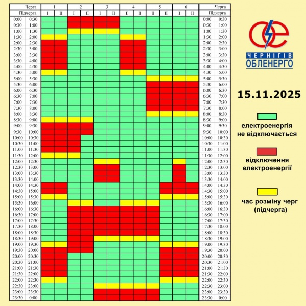 В Черниговской области, по команде НЭК "Укрэнерго", 15 ноября будет действовать такой график почасовых отключений (ГПВ).
