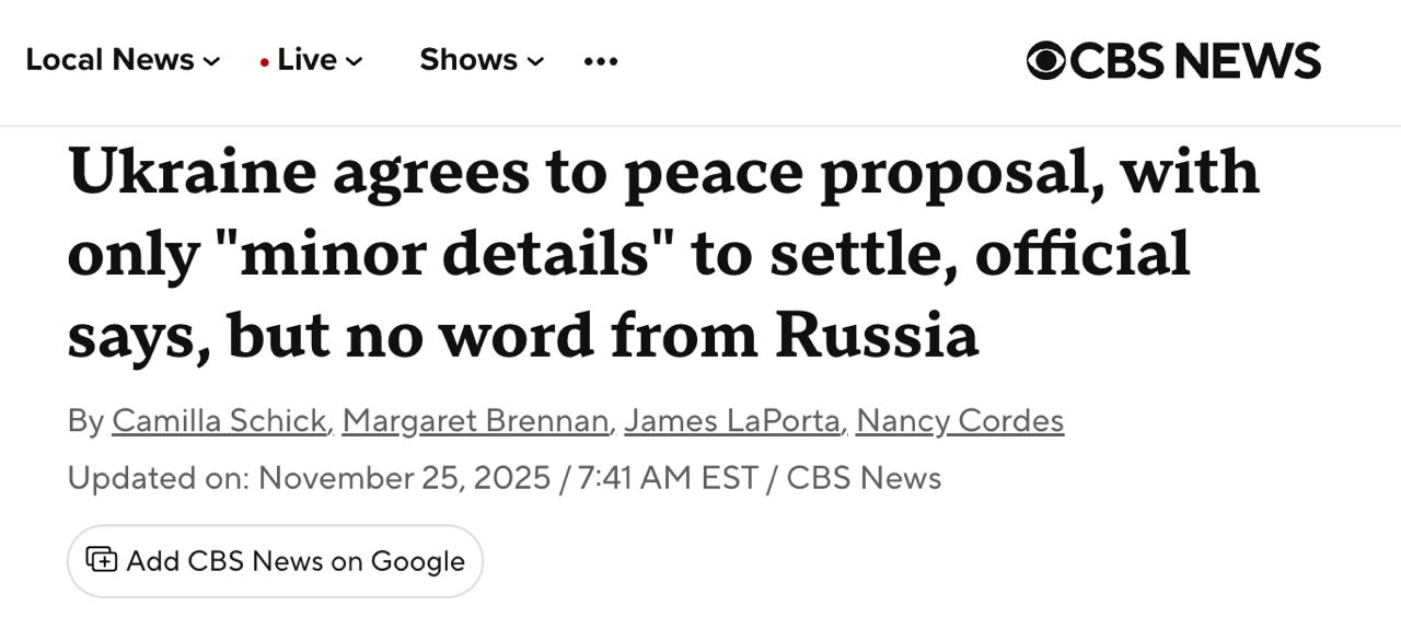 Украина согласилась принять мирный план США, но еще нужно согласовать некоторые детали условий окончания войны.