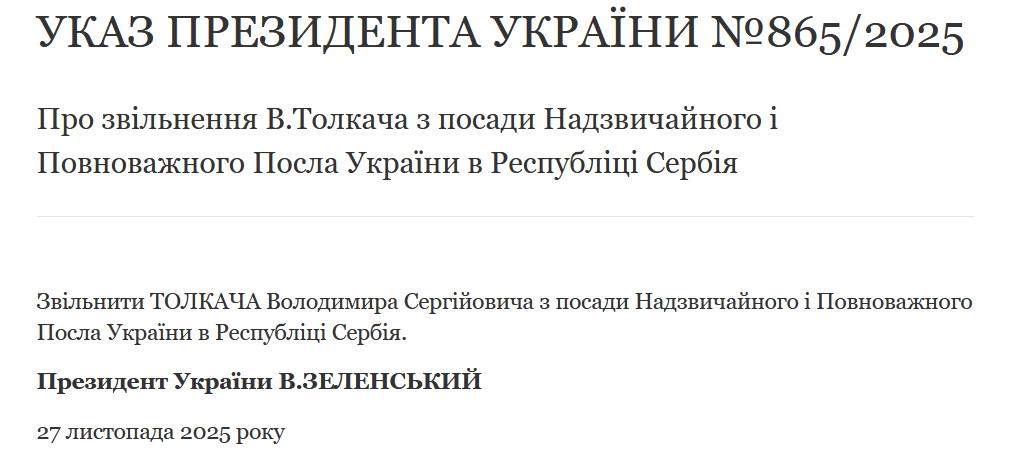 Другим своим указом Зеленский уволил с должности посла Украины в Сербии Владимира Толкача.