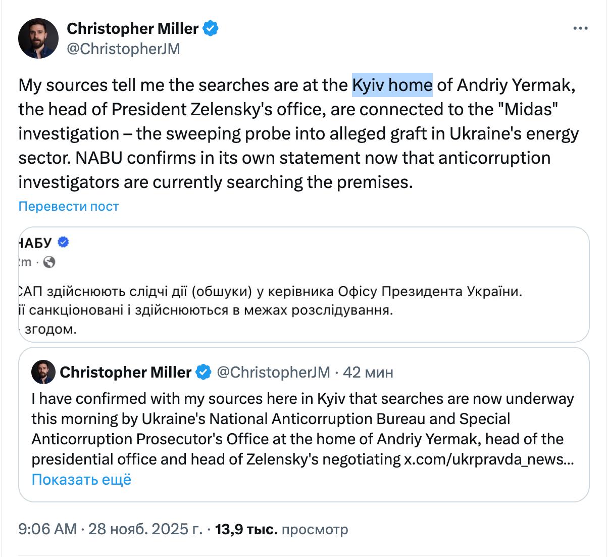 Издание "Украинская правда" уточнило, что обыски ведутся в правительственном квартале. А журналист Financial Times Кристофер Миллер со ссылкой на источники написал в Х, что они идут у Ермака дома. По его данным, следственные действия связаны с делом о коррупции в энергетике.