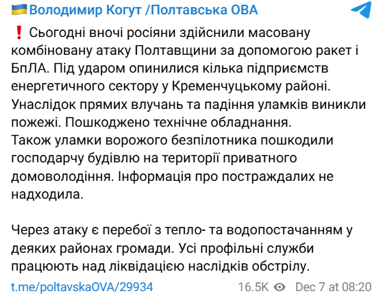 В ночь на 7 декабря армия РФ нанесла массированный удар по Кременчугу в Полтавской области.