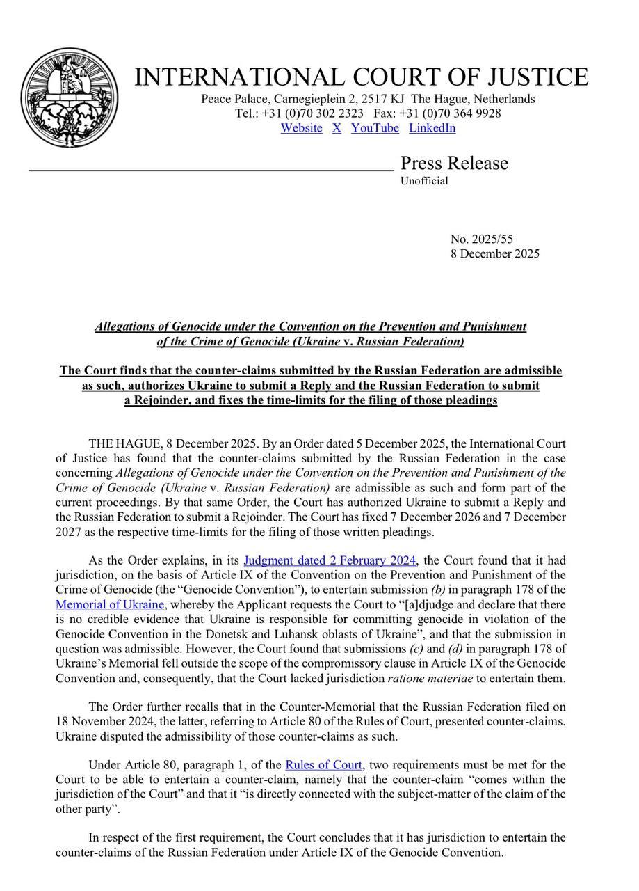 Согласно судебному решению, Украина должна подать ответ на претензии РФ до 7 декабря 2026 года, а Москва - ответить на это своими аргументами до 7 декабря 2027 года.