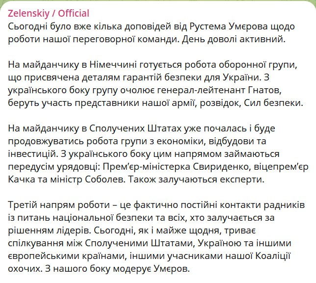 "Третье направление работы – это фактически постоянные контакты советников по национальной безопасности и всех, кто привлекается по решению лидеров. Сегодня, как и почти каждый день, идет общение между Соединенными Штатами, Украиной и другими европейскими странами, другими участниками нашей коалиции желающих. С нашей стороны модерирует Умеров", – добавил Зеленский.