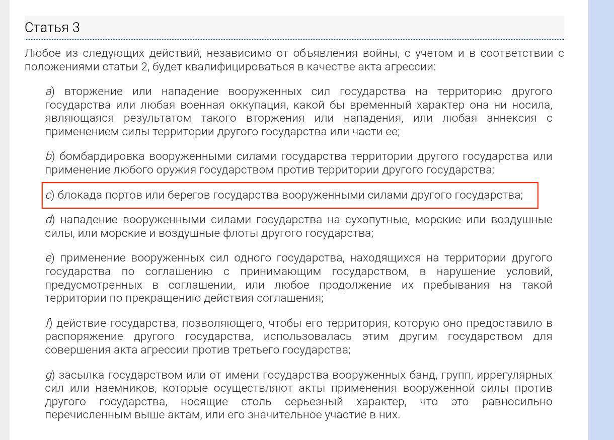 Впрочем, этот нюанс имеет не слишком большое значение, так как отношение к войне в Украине у разных стран мира уже давно определяется не столько нормами международного права, сколько геополитическими и экономическими интересами. Куда более важен другой аспект, а именно создание прецедента морской блокады без санкции ООН, который может быть использован и против других стран, в первую очередь, России и Китая.