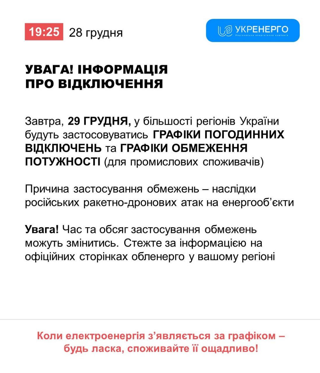 19:37 Завтра в большинстве регионов Украины будут действовать графики отключений.
