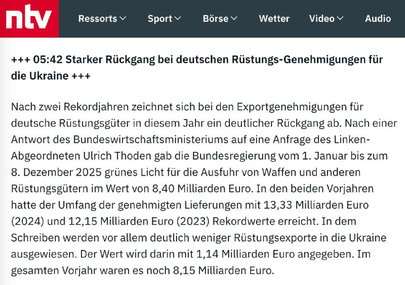 С 1 января по 8 декабря текущего года федеральное правительство одобрило экспорт оружия и другого военного оборудования на сумму 8,40 миллиарда евро, конкретно оружия - на 1,14 миллиарда евро. Для сравнения, в предыдущие два года объем разрешенных поставок достиг рекордных значений в 13,33 миллиарда евро (в 2024 году) и 12,15 миллиарда евро (в 2023-м).