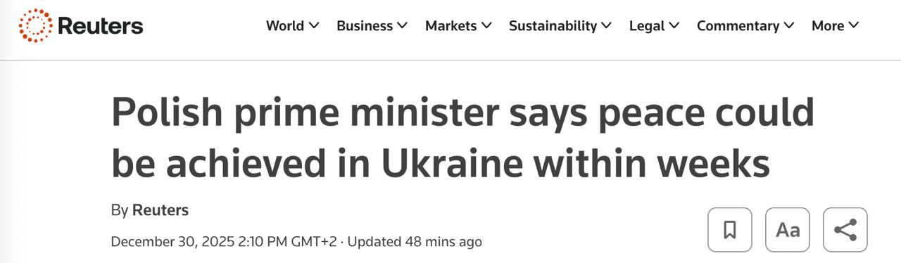 "Мир на горизонте. Нет сомнений, что произошли события, дающие основания надеяться, что эта война может закончиться, и довольно быстро, но это всё ещё надежда, далеко не стопроцентная. Когда я говорю, что мир на горизонте, я имею в виду ближайшие недели, а не месяцы или годы. К январю мы все должны будем собраться вместе... чтобы принять решения о будущем Украины, будущем этой части мира", - сказал Туск.