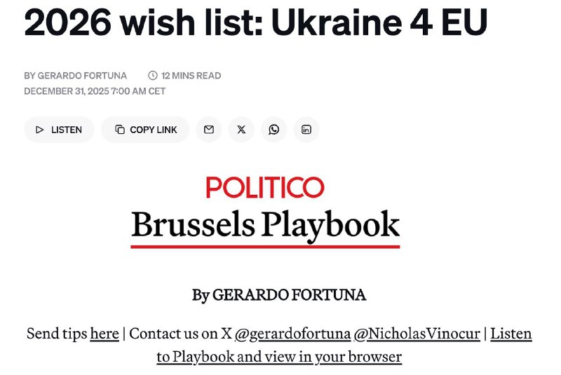 "Закрепление членства в ЕС в мирном плане может оказаться единственным политически жизнеспособным способом сдвинуть этот вопрос с мёртвой точки в 2026 году, тем самым превращая его в определённом смысле в самое стратегически важное новогоднее решение Брюсселя", - пишет Politico.