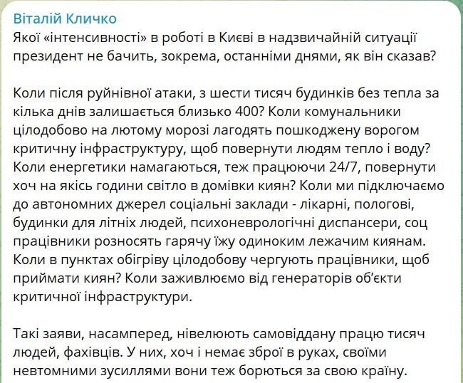 "Какой "интенсивности" в работе в Киеве в чрезвычайной ситуации президент не видит, в частности, в последние дни, как он сказал?" - задается вопросом Кличко.