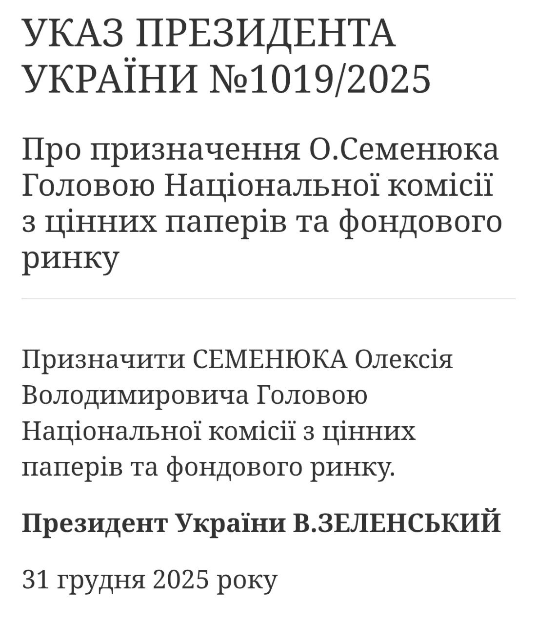 "Назначить Семенюка Алексея Владимировича председателем Национальной комиссии по ценным бумагам и фондовому рынку", - сказано в документе.