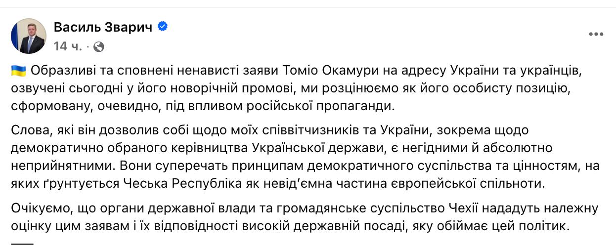 На слова спикера отреагировал в Фейсбуке посол Украины в Чехии Василий Зварич. По словам дипломата, "оскорбительные и наполненные ненавистью" заявления Окамуры в адрес Украины сформированы "под влиянием российской пропаганды". Он назвал "недостойными и неприемлемыми" заявления спикера.
