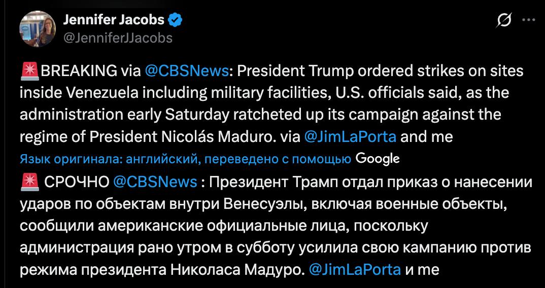 9:36 Трамп отдал приказ о нанесении ударов по объектам Венесуэлы, включая военные.