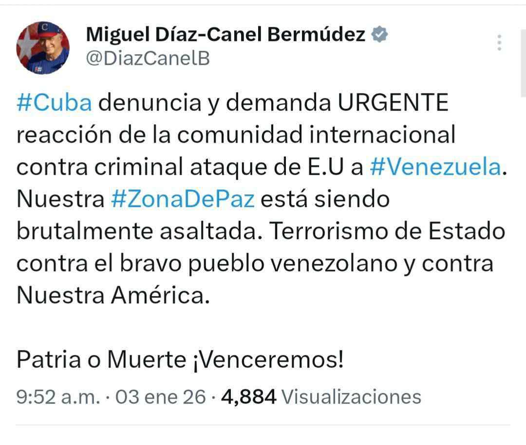 10:30 Президент Кубы Мигель Диас-Канель обвинил США в нападении на Венесуэлу. Он заявил, что Гавана требует срочной реакции мира на "преступную атаку США на Венесуэлу".