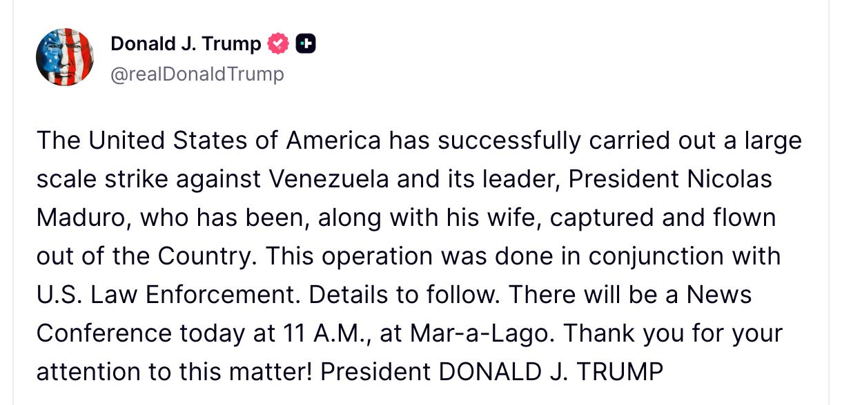 11:42 "Соединенные Штаты Америки успешно провели масштабный удар по Венесуэле и её лидеру, президенту Николасу Мадуро, который вместе с женой был захвачен и вывезен из страны. Эта операция проводилась совместно с правоохранительными органами США. Подробности будут позже. Сегодня в 11 утра в Мар-а-Лаго (в 18:00 по Киеву - Ред.) состоится пресс-конференция", - написал президент США.