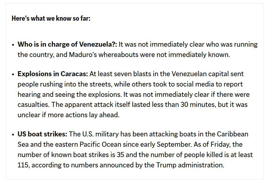 8:44 CNN подтверждает множественные взрывы в столице Венесуэлы и заявляет, что в Каракасе слышна работа авиации.