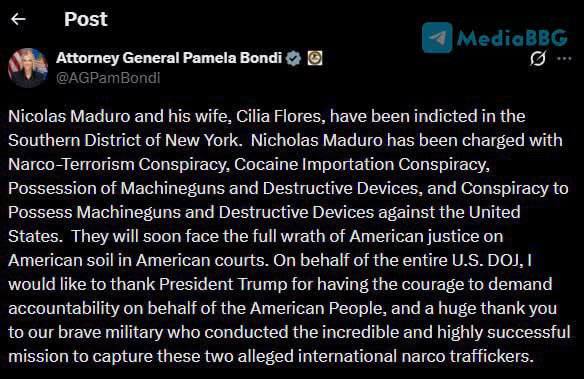 "Николас Мадуро и его жена Силия Флорес были обвинены в Южном округе Нью-Йорка. Николас Мадуро обвиняется в заговоре с целью наркотерроризма, заговоре с целью импорта кокаина, владении автоматическим оружием и разрушительными устройствами, а также заговоре с целью владения автоматическим оружием и разрушительными устройствами против Соединенных Штатов. Вскоре они столкнутся с полным гневом американского правосудия на американской земле в американских судах", - заявила Бонди.