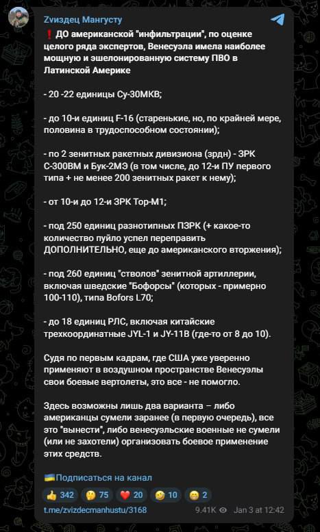 14:25 США провели атаку по Венесуэле несмотря на то, что эта страна имела самую мощную систему ПВО в Латинской Америке, пишет украинский военный эксперт Константин Машовец, не исключая, что имел место "договорняк".