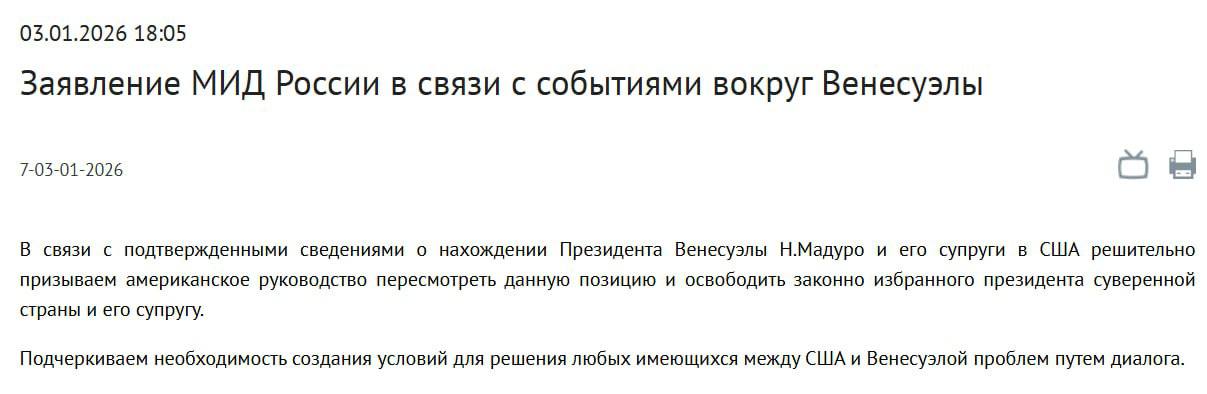 "Сегодня утром США совершили акт вооруженной агрессии против Венесуэлы. Это вызывает глубокую озабоченность и осуждение. Предлоги, приводящиеся в обоснование таких действий, несостоятельны. Идеологизированная неприязнь взяла верх над деловым прагматизмом, готовностью выстраивать отношения доверия и предсказуемости", - заявило ведомство. Подробнее...
