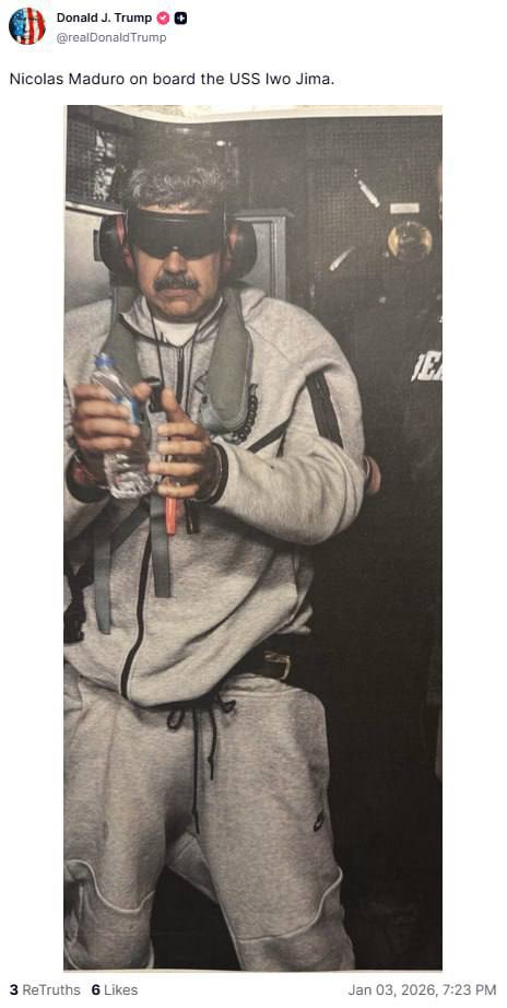 12:41 Пишут, что это первое фото задержанного американцами президента Венесуэлы Мадуро.