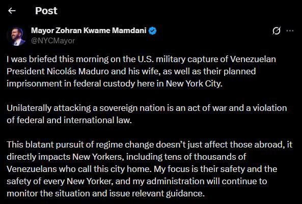 "Эта откровенная попытка смены режима затрагивает не только тех, кто находится за рубежом. Она напрямую влияет на жителей Нью-Йорка, включая десятки тысяч венесуэльцев, которые считают этот город своим домом. В центре моего внимания - их безопасность и безопасность каждого жителя Нью-Йорка", - заявил он.