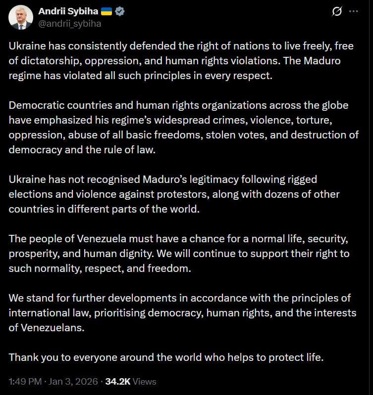 Глава Министерства иностранных дел Украины Андрей Сибига поддержал атаку США на Венесуэлу и похищение президента страны Николаса Мадуро.