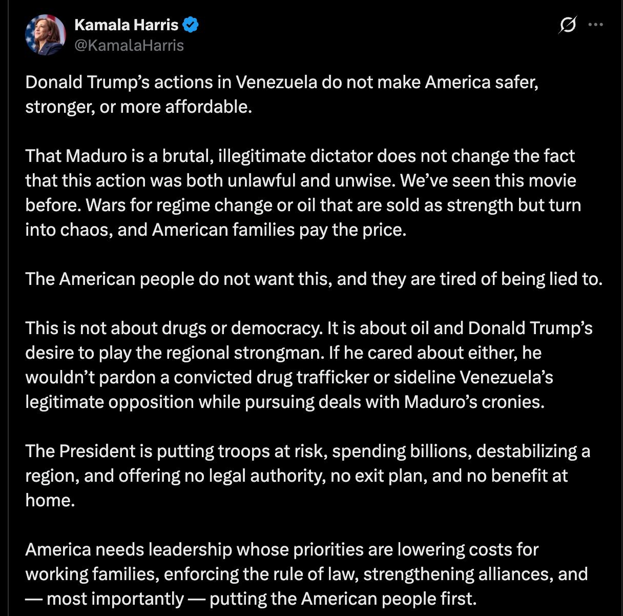 "То, что Мадуро — жестокий и нелегитимный диктатор, не меняет того факта, что эти действия были одновременно незаконными и неразумными. Мы уже видели этот фильм. Войны за смену режима или за нефть, которые продают как проявление силы, в итоге оборачиваются хаосом, а расплачиваются за это американские семьи", - заявила Харрис.