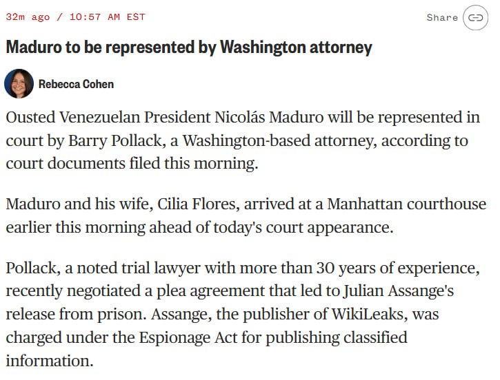 В свою очередь телеканал NBC News сообщает, что Мадуро будет защищать один из самых известных судебных адвокатов США.