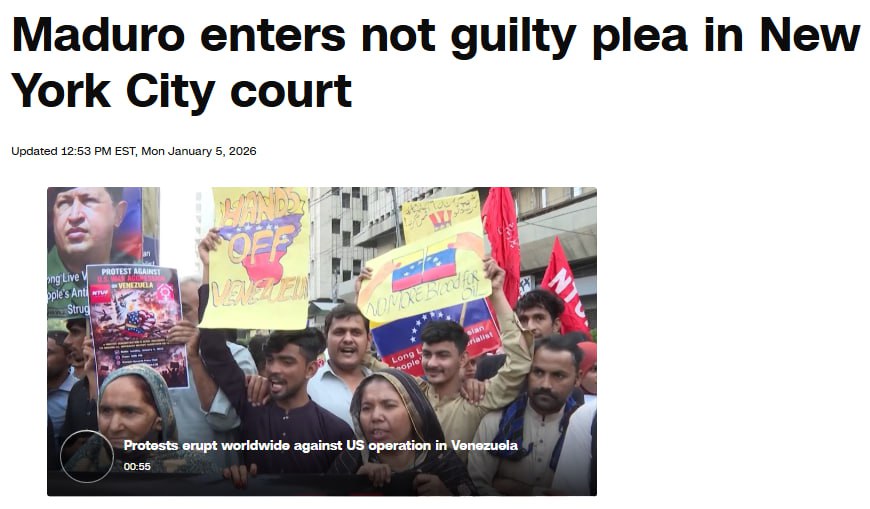 Напомним, сегодня в Нью-Йорке вертолет доставил Мадуро в суд. Если его признают виновным по федеральным обвинениям в торговле наркотиками и другим преступлениям, ему грозит смертная казнь. Но скорее всего он проведет остаток жизни в тюрьме.