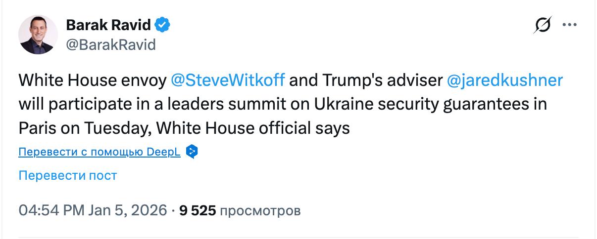 Специальный представитель президента США Стивен Уиткофф и зять Дональда Трампа Джаред Кушнер завтра, 6 января, обсудят с лидерами Евросоюза гарантии безопасности для Украины.