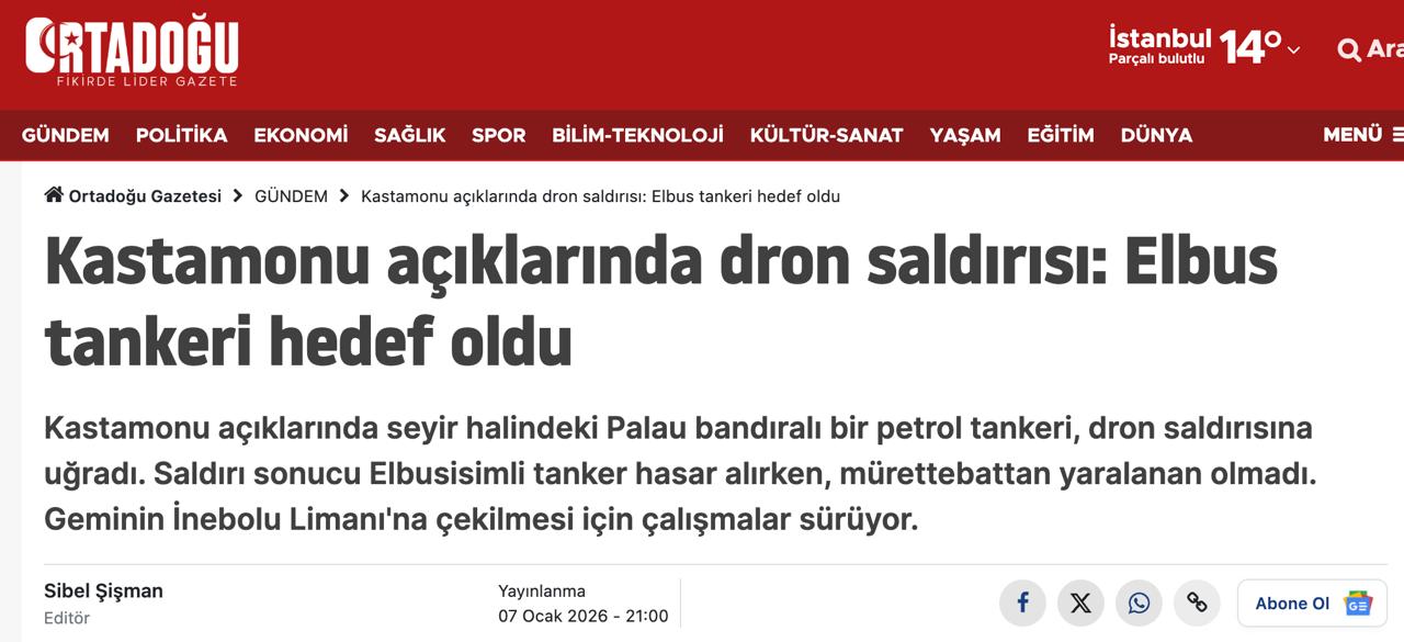 У берегов Турции, близ города Кастамону, беспилотник атаковал нефтяной танкер "Эльбус" под флагом Палау, который шёл к черноморскому побережью России. Судно получило повреждения верхней части.