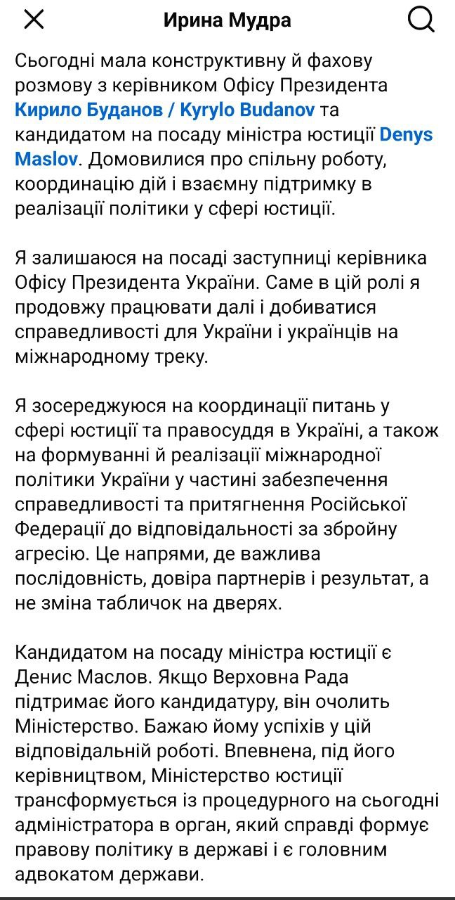 "Уверена, под его (Маслова - Ред.) руководством Министерство юстиции трансформируется из процедурного на сегодня администратора в орган, который действительно формирует правовую политику в государстве и является главным адвокатом государства", - написала Мудрая.