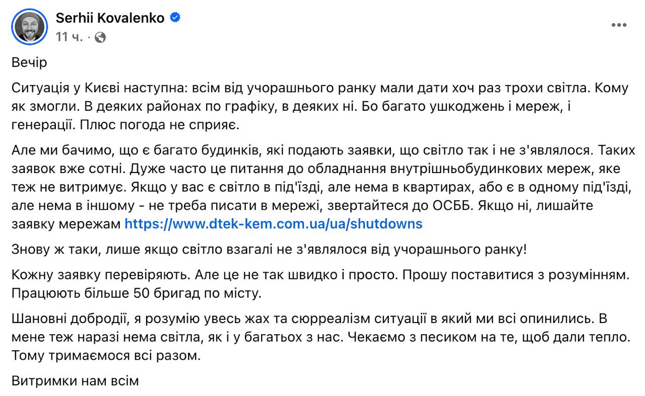 "Мы видим, что есть много домов, которые подают заявки о том, что свет так и не появлялся. Таких заявок уже сотни. Очень часто это вопрос к оборудованию внутридомовых сетей, которое тоже не выдерживает. Каждую заявку проверяют. Но это не так быстро и просто. Прошу отнестись с пониманием. В городе работают более 50 бригад", - заявил Коваленко.
