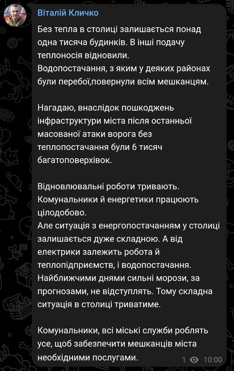При этом мэр Киева Виталий Кличко подтвердил, что в столице без тепла остаются более тысячи домов. Водоснабжение, с перебоями в отдельных районах, возобновили для всех жителей.