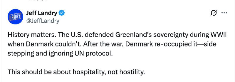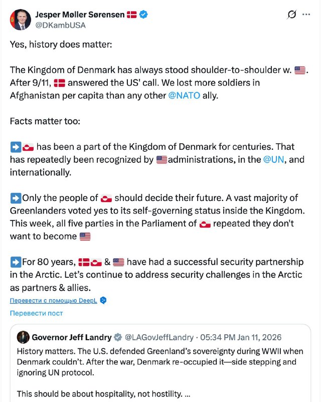 Спецпредставитель президента США Дональда Трампа по Гренландии и губернатор Луизианы Джефф Лэндри заявил, что после Второй мировой войны Дания оккупировала остров в обход норм ООН.
