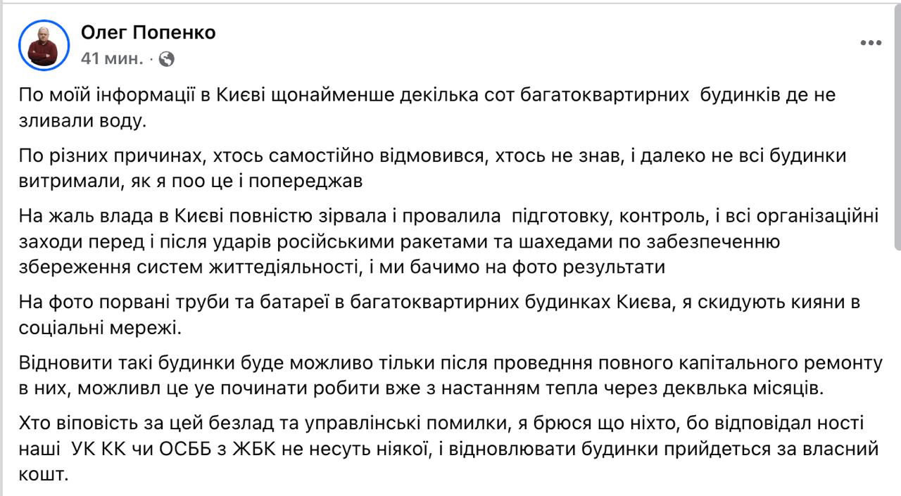 "К сожалению, власти в Киеве полностью сорвали и провалили подготовку, контроль и все организационные мероприятия по обеспечению сохранения систем жизнедеятельности перед ударами и после ударов российскими ракетами и дронами, и мы видим результаты. Восстановить такие дома будет возможно только после проведения полного капитального ремонта в них. Это можно начинать делать уже с наступлением тепла через несколько месяцев", - написал он.