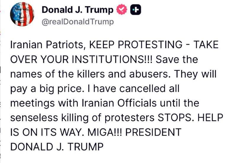 "Иранские патриоты, продолжайте протестовать, берите под контроль свои институты! Сохраняйте имена убийц и тех, кто злоупотребляет властью. Они заплатят высокую цену. Я отменил все встречи с иранскими официальными лицами до тех пор, пока бессмысленные убийства протестующих не прекратятся. Помощь уже в пути", - сказано в публикации президента США.