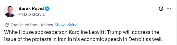 Между тем журналист портала Axios Барак Равид со ссылкой на пресс-секретаря Белого дома Кэролайн Ливитт сообщил, что Дональд Трамп затронет тему протестов в Иране в своей экономической речи в Детройте.