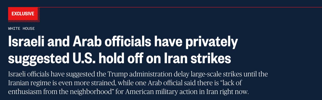 Израильские чиновники предложили Белому дому отложить крупномасштабные удары до тех пор, пока иранский режим не окажется в еще более напряженном положении из-за протестов. Они заявили, что полностью поддерживают смену режима в Тегеране и усилия США по содействию этому, но обеспокоены, что внешнее военное вмешательство в данный момент может помешать протестующим.