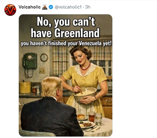 На второй Дональду Трампу, который сидит за обеденным столом, женщина накладывает еду со словами: "Нет, ты не можешь получить Гренландию - ты еще не закончил с Венесуэлой".