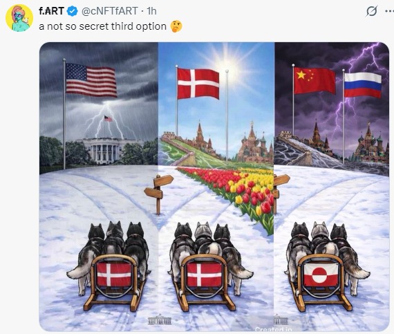 В официальном аккаунте Белого дома в соцетях появилось изображение собачьей упряжки, перед которой открываются два пути: в сторону Вашингтона и в сторону Пекина и Москвы. Изображение сопровождается подписью: "Куда пойдёте, гренландцы?"