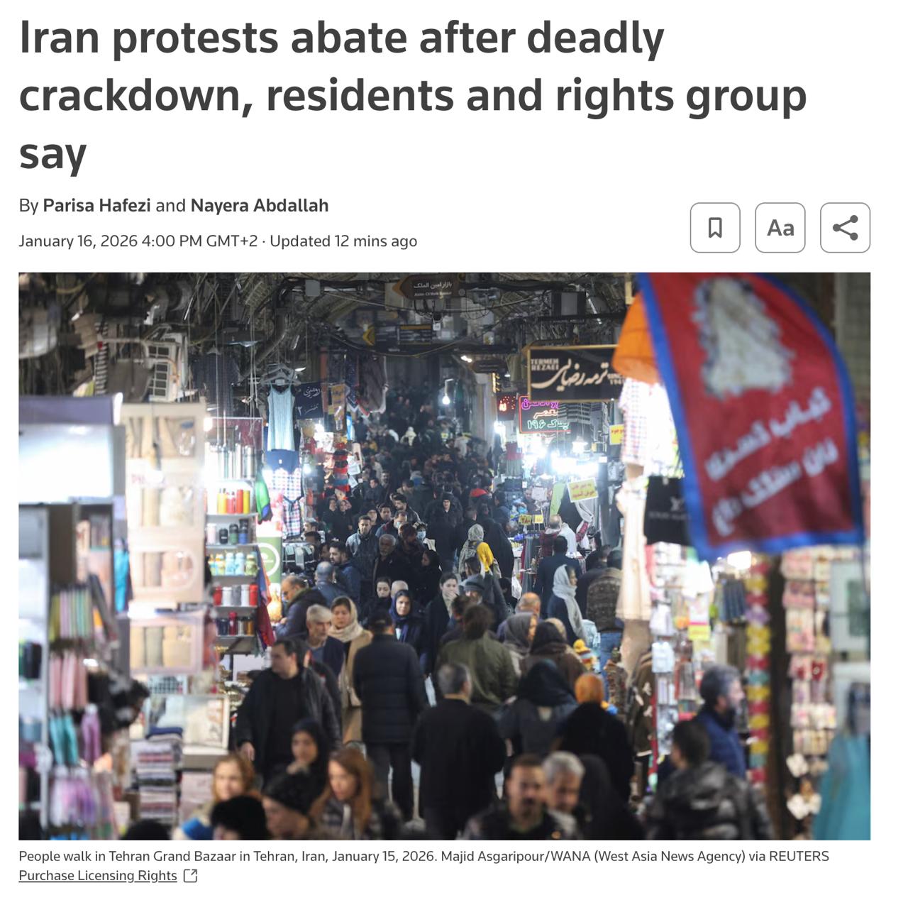 Несколько жителей Тегерана заявили, что в столице еще с воскресенья царит спокойствие. Они сказали, что над городом летают дроны, хотя в четверг и пятницу они не видели никаких признаков протестов.