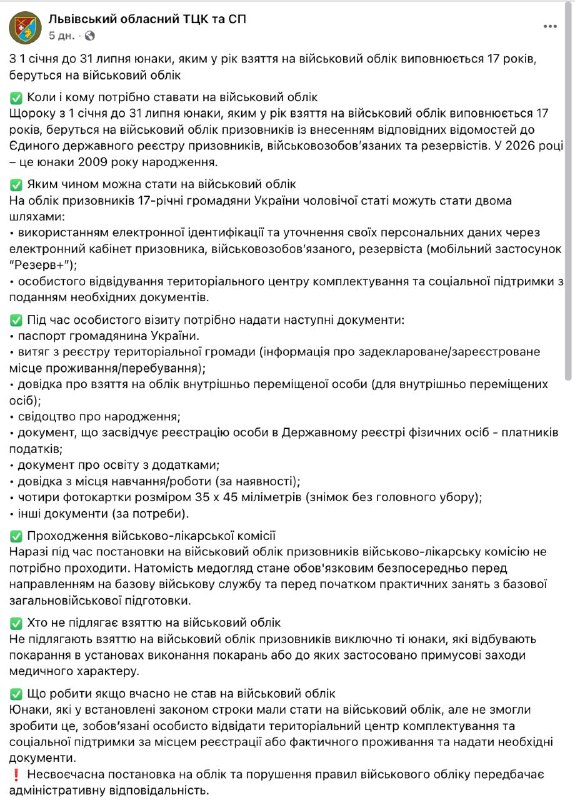 11:34 Львовский ТЦК уже начинает напоминать юношам, которым в этом году исполнится 17 лет, что до 31 июля им нужно встать на воинский учет.