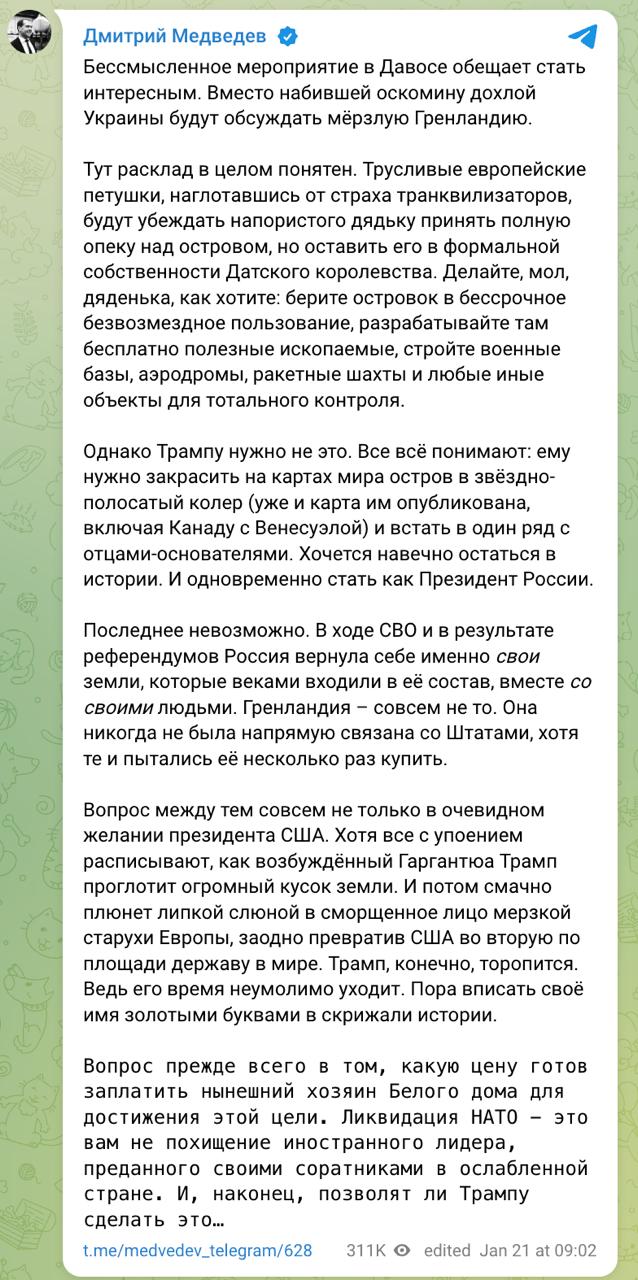 Заместитель председателя Совета безопасности Российской Федерации Дмитрий Медведев заявил, что захват Гренландии американцами будет менее законным, чем претензии Москвы на территории Украины, поскольку Россия возвращает себе свои земли, веками входившие в ее состав.