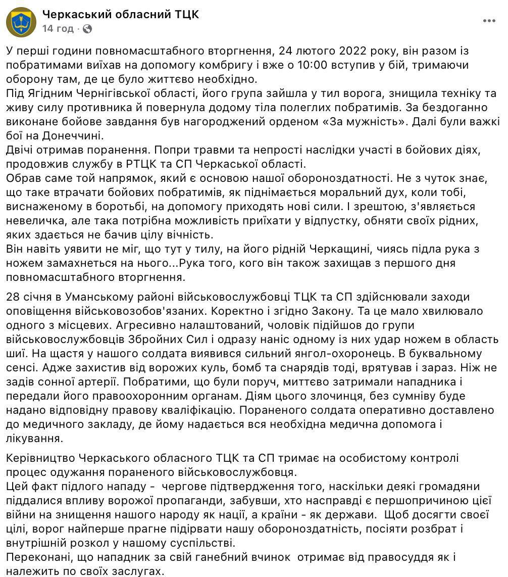 "28 января в Уманском районе военнослужащие ТЦК и СП проводили мероприятия по оповещению военнообязанных. Корректно и согласно закону. Но это мало волновало одного из местных. Агрессивно настроенный мужчина подошел к группе военнослужащих Вооруженных сил и сразу нанес одному из них удар ножом в область шеи. К счастью, у нашего солдата оказался сильный ангел-хранитель... Нож не задел сонную артерию. Товарищи, которые были рядом, мгновенно задержали нападавшего и передали его правоохранительным органам. Действия этого преступника, без сомнения, получат соответствующую правовую квалификацию. Раненый солдат оперативно доставлен в медицинское учреждение, где ему оказывается вся необходимая медицинская помощь и лечение", - говорится в публикации.