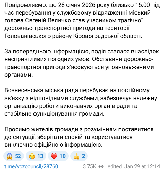 Горсовет Вознесенска сообщил, что около 16:00 во время служебной командировки мэр Евгений Величко стал участником трагической аварии.