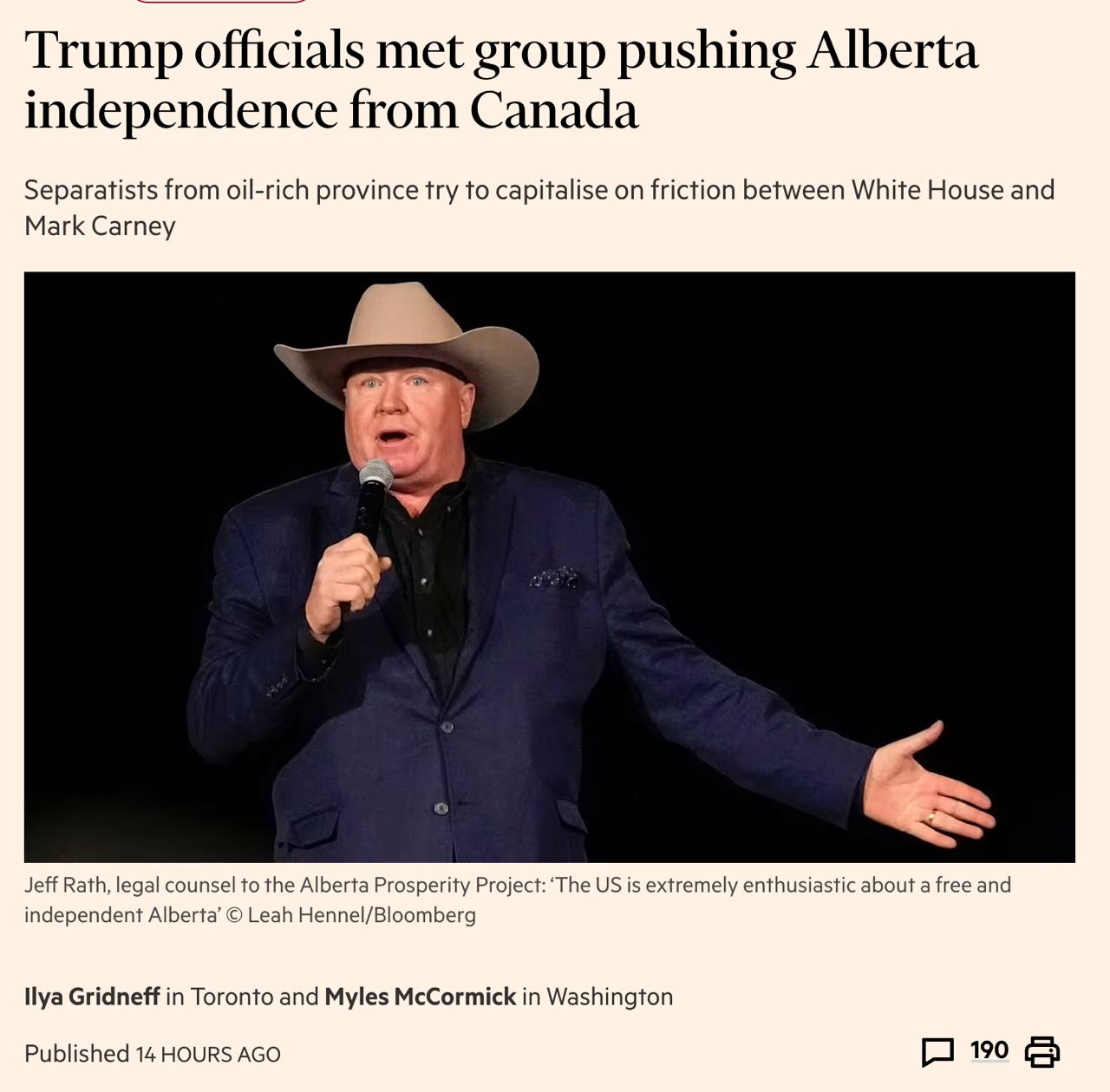 А министр финансов США Бессент заявлял о возможном референдуме о независимости Альберты.