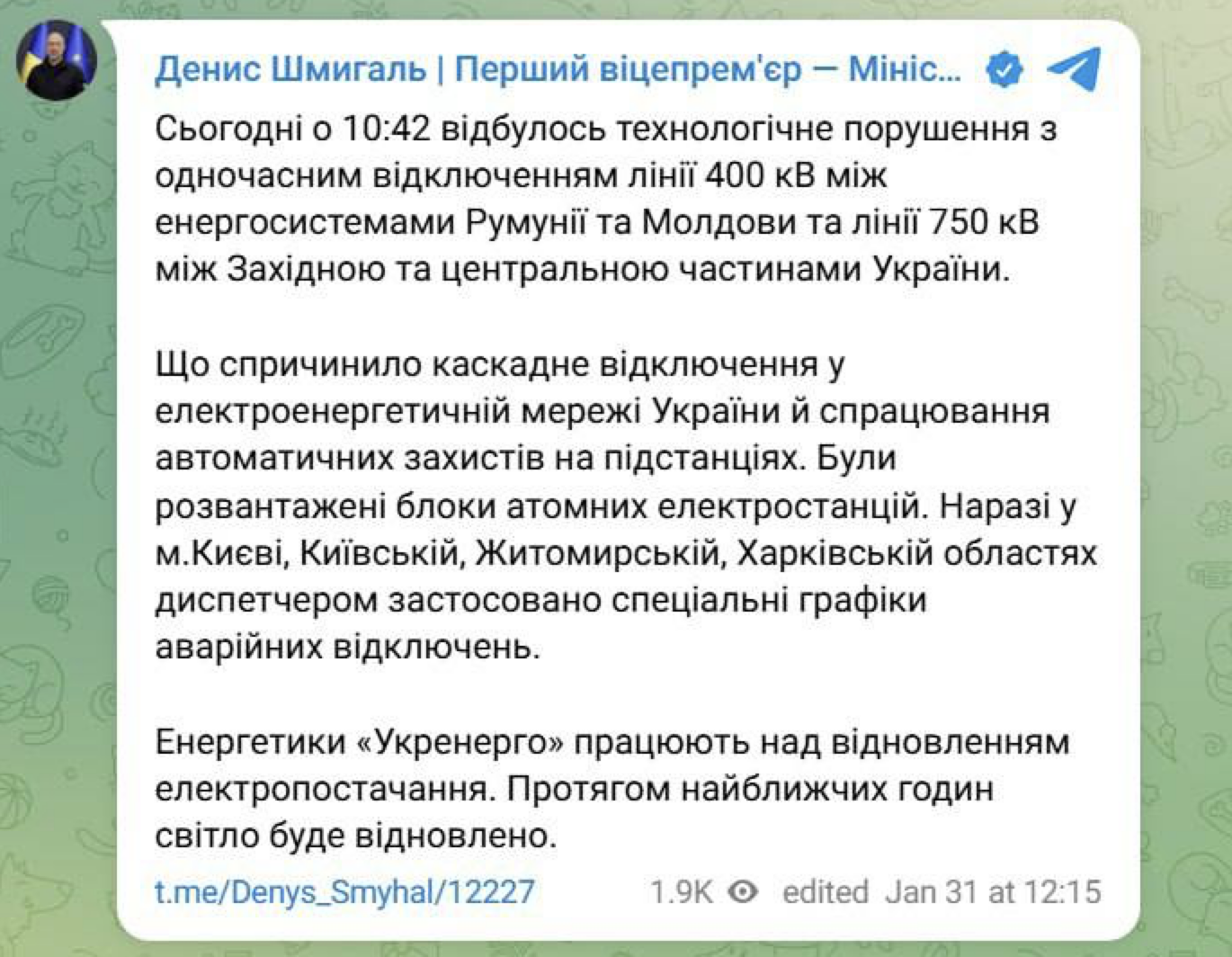 "Утром произошли две аварии на высоковольтных линиях с минутным интервалом. Это привело к каскадным отключениям в семи областях страны. Версии о кибератаке или внешнем вмешательстве не подтвердились. По предварительным оценкам, это произошло из-за обледенения линий и оборудования", - заявил министр.