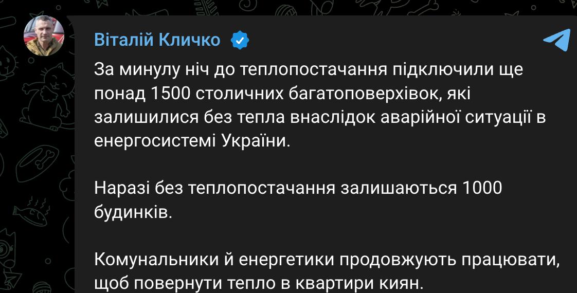 8:49 После вчерашней аварии в энергосистеме без тепла в Киеве остается 1000 домов, заявил Кличко.